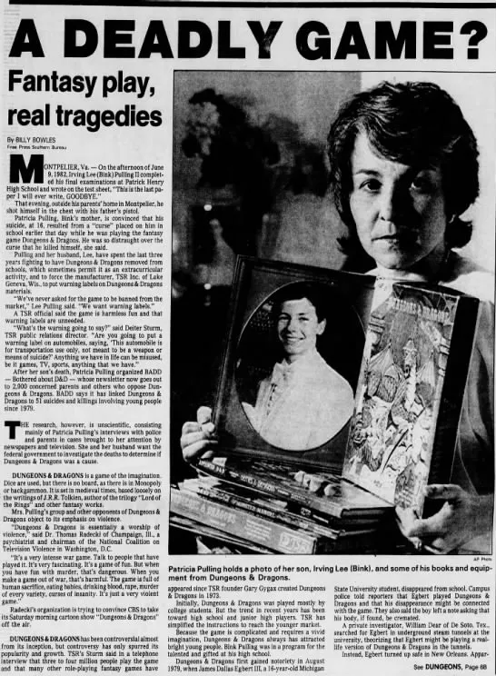 Three years later, a woman named Patricia Pulling lost her son Irving to suicide. He was sixteen. He shot himself with his mother's gun, two weeks after losing a student council election at school. Pulling needed an explanation that didn't implicate her own weapon or her son's isolation or the cruelty of high school social hierarchies. She found one: a Dungeons & Dragons game run by his school principal had put a "curse" on Irving's character. The curse, she decided, had driven him to his death.